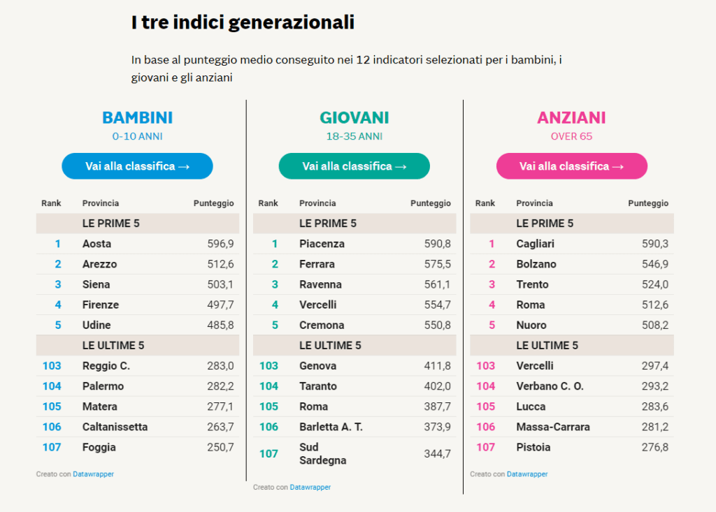 Aosta, ad esempio, si piazza al 1° posto per i bambini, al 6° posto per gli anziani; e scivola al 37° posto, invece, per i giovani. Piacenza, in testa per i giovani, scende al 42° posto per gli anziani e al 75° posto per i bambini. Infine Cagliari, che conquista il primato nel benessere degli anziani, perde posizioni negli altri due indici (21° posto in quello dei bambini e 80° posto per i giovani).