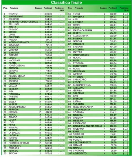 Qualità della vita, Piacenza al 32esimo posto nella classifica di Italia Oggi. La nostra provincia perde quattro posizioni rispetto alla graduatoria di 12 mesi fa. Invece è Trento ad aggiudicarsi la palma di miglior territorio. La provincia autonoma, eccellenza dagli affari al turismo, svetta nella classifica annuale di ItaliaOggi e Università La Sapienza di Roma. All’ultimo posto invece si piazza Agrigento.