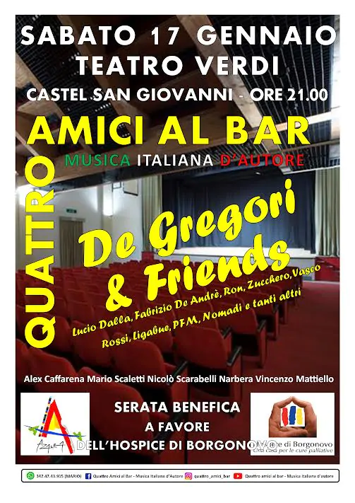 Sabato 17 gennaio prossimo, dalle ore 21.00, presso il, “Teatro Verdi” di Castel San Giovanni, si svolgerà un concerto della band piacentina “Quattro Amici al Bar – Musica Italiana d’autore” organizzato da ASP Azalea, in favore dell’Hospice di Borgonovo V.T. a cui sarà devoluto l’intero incasso della serata, con il patrocinio del Comune di Castel San Giovanni che mette gratuitamente a disposizione dell’iniziativa il Teatro. L’ingresso sarà ad offerta.