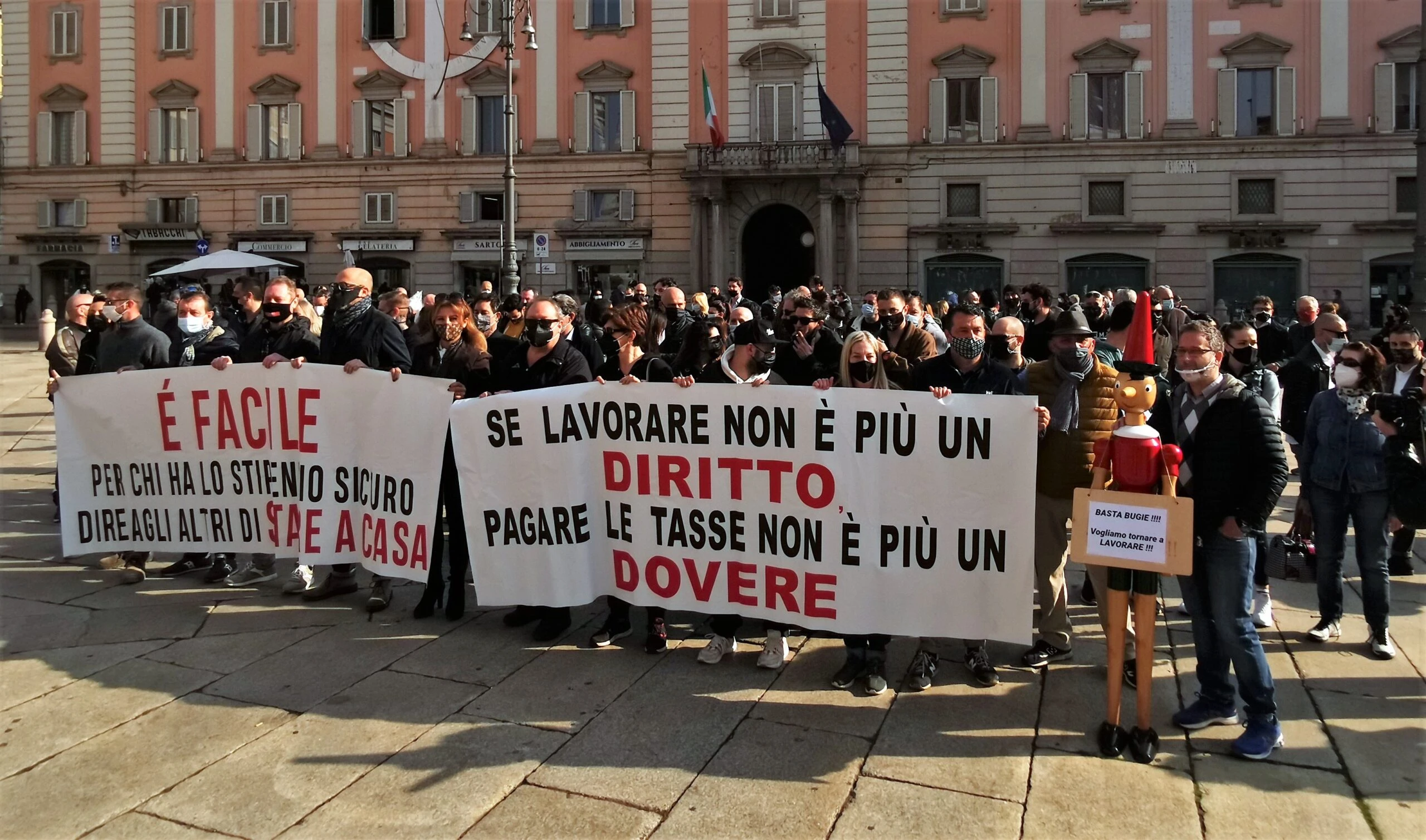 Un Pinocchio di grandi dimensioni con il cartello “Basta bugie”. E’ la sintesi perfetta del messaggio che esercenti e partite IVA hanno voluto lanciare al governo nel corso della manifestazione di questa mattina in piazza Cavalli. Esercenti e partite IVA chiedono un cambio di rotta radicale.