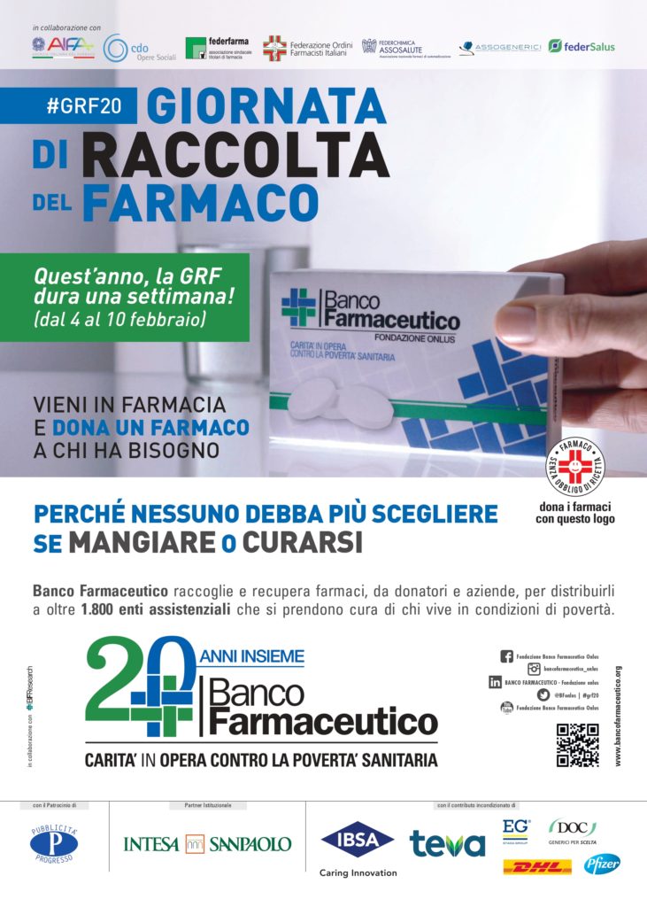 Nel 2020, Banco Farmaceutico compie 20 anni. In tale occasione, la GRF – Giornata di Raccolta del Farmaco durerà una settimana, dal 4 al 10 febbraio (il giorno principale sarà sabato 8 febbraio). La decisione di estendere le attività di raccolta ad una settimana deriva soprattutto dalla necessità di rispondere in maniera più efficace al fabbisogno espresso dagli enti.