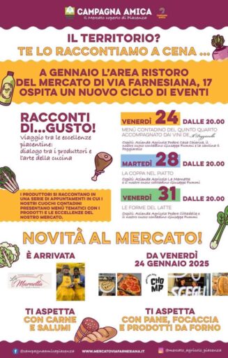 “Parte questo nuovo ciclo di appuntamenti nella nostra area di ristoro del mercato coperto di Campagna Amica di Via Farnesiana 17 a Piacenza – anticipa Valerio Galli Responsabile Provinciale Campagna Amica Piacenza – il primo appuntamento domani venerdì 24 gennaio dalle 20 con la prima cena di Racconti di… gusto, per poi proseguire con altre due appuntamenti martedì 28 e venerdì 31 Gennaio. Sono tutti menù da scoprire sia sulle nostre pagine social anche da provare direttamente al nostro mercato, si tratta di un percorso che esalta il nostro made in Italy e i sapori piacentini”.