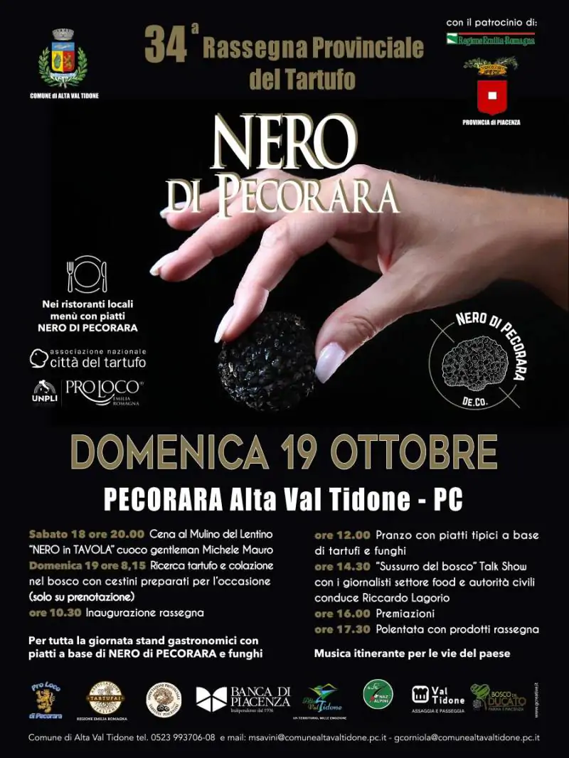 Il programma. La giornata clou della sagra è domenica 19 ottobre con un mercatino di oltre 50 espositori per le vie del paese tra cui più della metà di tartufi, funghi e altri prodotti del territorio, e un fitto programma di iniziative che parte già alle 8.15 del mattino con la Ricerca del tartufo nel bosco (attività su prenotazione 0523993706-08) e colazione con cestini preparati dall’organizzazione. Alle ore 10.30 l’inaugurazione ufficiale a Pecorara e alle 12.00 il pranzo con piatti tipici a base di tartufi e funghi, sia nei ristoranti del paese sia negli stand gestiti dalla Pro Loco. Alle ore 14.30 un momento di approfondimento con il talk show “Sussurro nel bosco” con l’intervento di giornalisti del settore food moderati da Riccardo Lagorio. Alle 16.00 le premiazioni e alle 17.30 la polentata con prodotti della rassegna.
