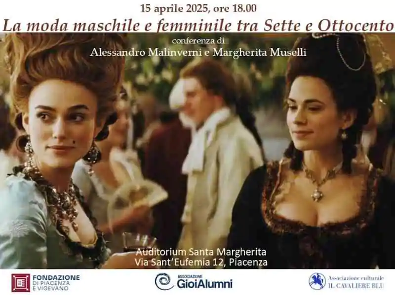 A conclusione della rassegna di cinema in costume “Realtà e finzione. Destini femminili tra Sette e Ottocento”, promossa dall’associazione GioiAlumni e dalla Fondazione di Piacenza e Vigevano, ideata e curata da Alessandro Malinverni, storico dell’arte e della moda e direttore del Museo Gazzola di Piacenza, il 15 aprile, alle 18.00 presso l’auditorium Santa Margherita della Fondazione di Piacenza e Vigevano, si terrà un incontro dal titolo “La moda maschile e femminile tra Sette e Ottocento”.