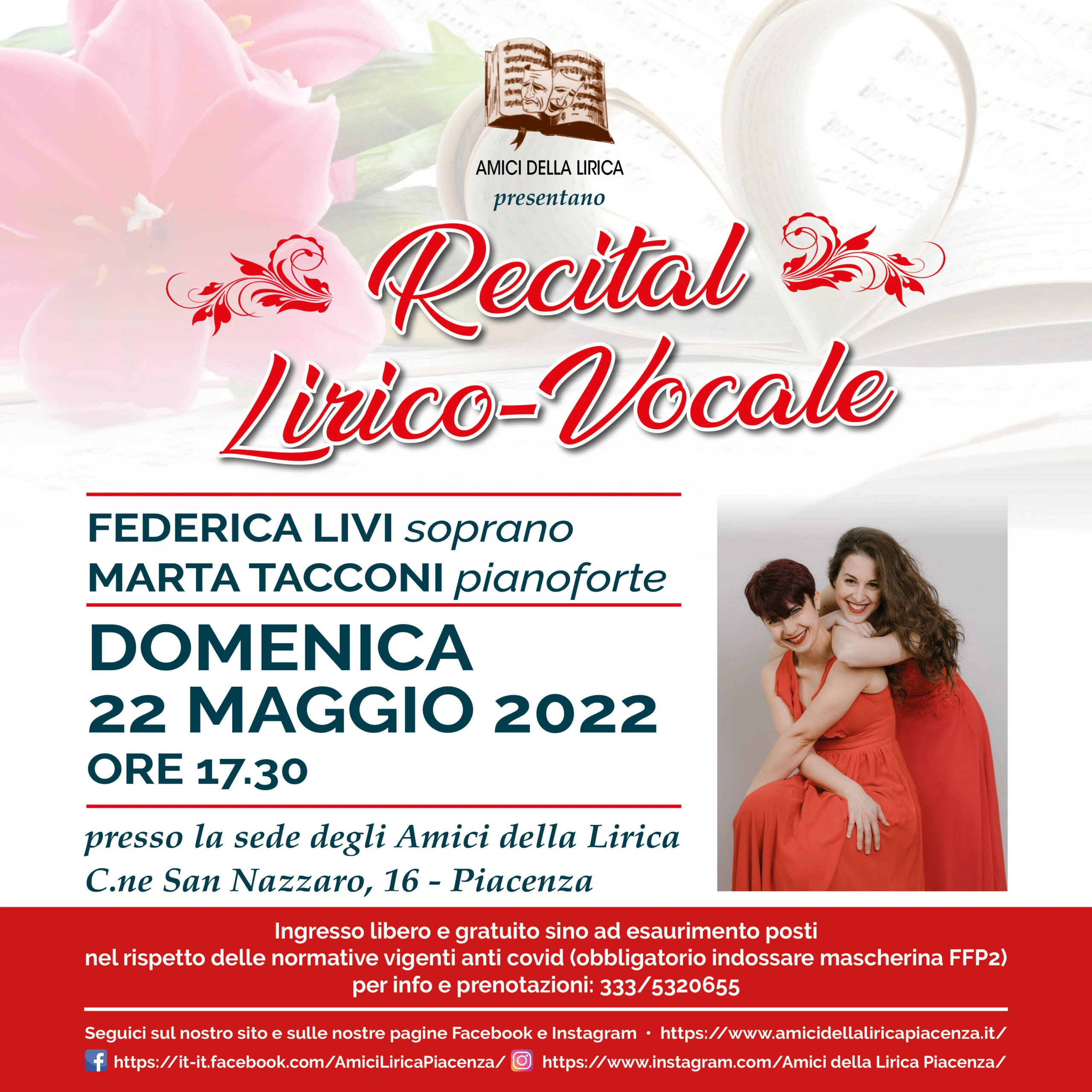 Secondo appuntamento del mese di maggio dell’Associazione Amici della Lirica con il Recital lirico-vocale del duo FEDERICA LIVI-MARTA TACCONI.