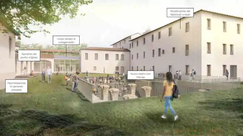 Il “Cortile del Teatro” sarà uno spazio unico. Un teatro all’aperto caratterizzato da grandi pilastri in mattoni originariamente progettati come fondazioni di un edificio mai realizzato, che diventeranno gli elementi scenografici del teatro ricavato nella depressione del terreno, dove sarà realizzata anche la tribuna per gli spettatori e, al piano interrato, saranno ricavate delle aule polifunzionali.