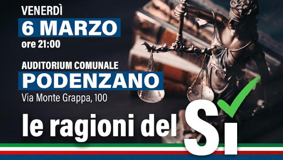 Si terrà venerdì 6 marzo alle ore 21.00 presso l’Auditorium Comunale di Podenzano (via Monte Grappa 100) l’incontro pubblico dal titolo “Le ragioni del Sì – Referendum riforma della giustizia”, promosso dalle forze politiche del centrodestra del territorio per offrire ai cittadini un momento di approfondimento e confronto sui contenuti della riforma.