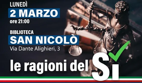 I rappresentanti del Centrodestra unito – esponenti di Fratelli d’Italia, Lega, Forza Italia e Noi Moderati – promuovono per lunedì 2 marzo alle ore 21.00, presso la Biblioteca di San Nicolò (Via Dante Alighieri, 3), un incontro pubblico dedicato alle ragioni del Sì al referendum sulla riforma della giustizia.