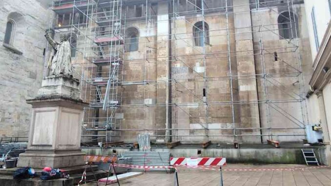Intorno alla Cattedrale verranno realizzate quattro aree di cantiere utili all’allestimento delle opere provvisionali e allo stoccaggio dei materiali, all’interno del cortile del Palazzo vescovile, nel giardino delle absidi ove sarà montata la gru, in corrispondenza dell’uscita del portale di via Guastafredda e in corrispondenza del portale del transetto sud prospettante sui Chiostri del Duomo.