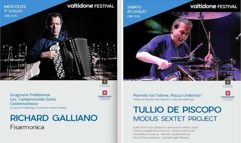 Sabato 20 luglio, alle ore 21.15 invece a Pianello Val Tidone, Piazza Umberto I: Tullio De Piscopo & Modus Sextet. In caso di maltempo lo spettacolo si terrà al Teatro di Pianello Val Tidone.