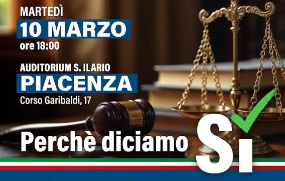 Si terrà martedì 10 marzo alle ore 18.00 presso l’Auditorium Sant’Ilario di Piacenza (Corso Garibaldi 17) un importante momento di approfondimento pubblico dedicato ai contenuti della riforma della giustizia e al referendum previsto per i giorni 22 e 23 marzo.