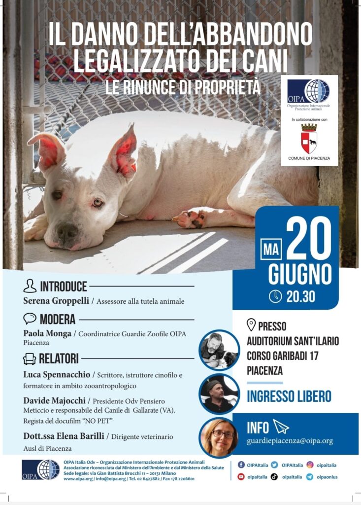 Il Comune di Piacenza e Oipa, L’Organizzazione Internazionale Protezione Animali , promuovono un incontro dal titolo: Il danno dell’abbandono legalizzato dei cani, le rinunce di Proprietà. L’appuntamento è martedì 20 giugno alle ore 20.30 all’Auditorium di Sant’Ilario in Corso Garibaldi 7 a Piacenza.