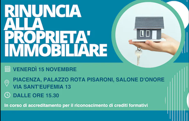 Proprio la rinuncia alla proprietà sarà oggetto del convegno che si terrà venerdì 15 novembre alle ore 15.30 a Piacenza, presso il Salone d’onore di Palazzo Rota Pisaroni, in via Sant’Eufemia n°13. Promosso dal Consiglio Notarile di Piacenza in collaborazione con l’Università Cattolica del Sacro Cuore e la Fondazione di Piacenza e Vigevano.