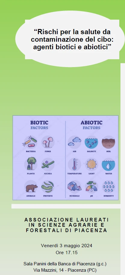 “Rischi per la salute da contaminazione del cibo: agenti biotici e abiotici” è il titolo del convegno organizzato dall’Associazione Laureati in Scienze Agrarie e Forestali di Piacenza che si terrà venerdì 3 maggio con inizio alle ore 17,15 presso la Sala Panini della Banca di Piacenza in via Mazzini, 14 a Piacenza.
