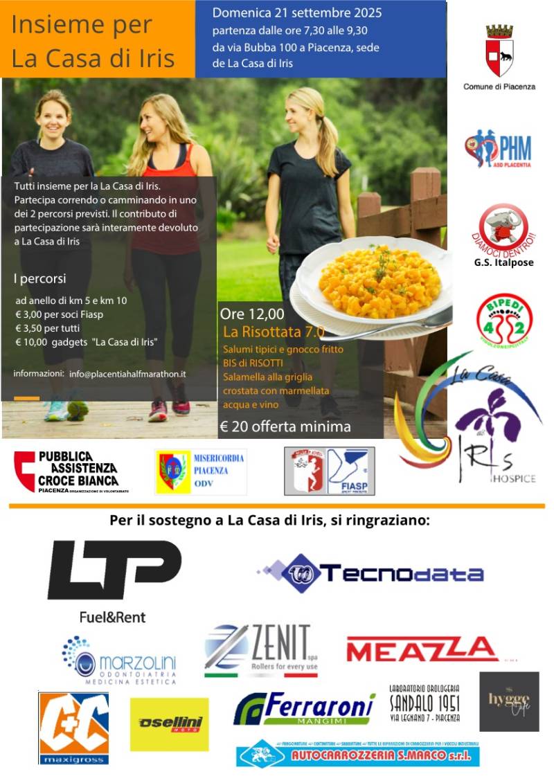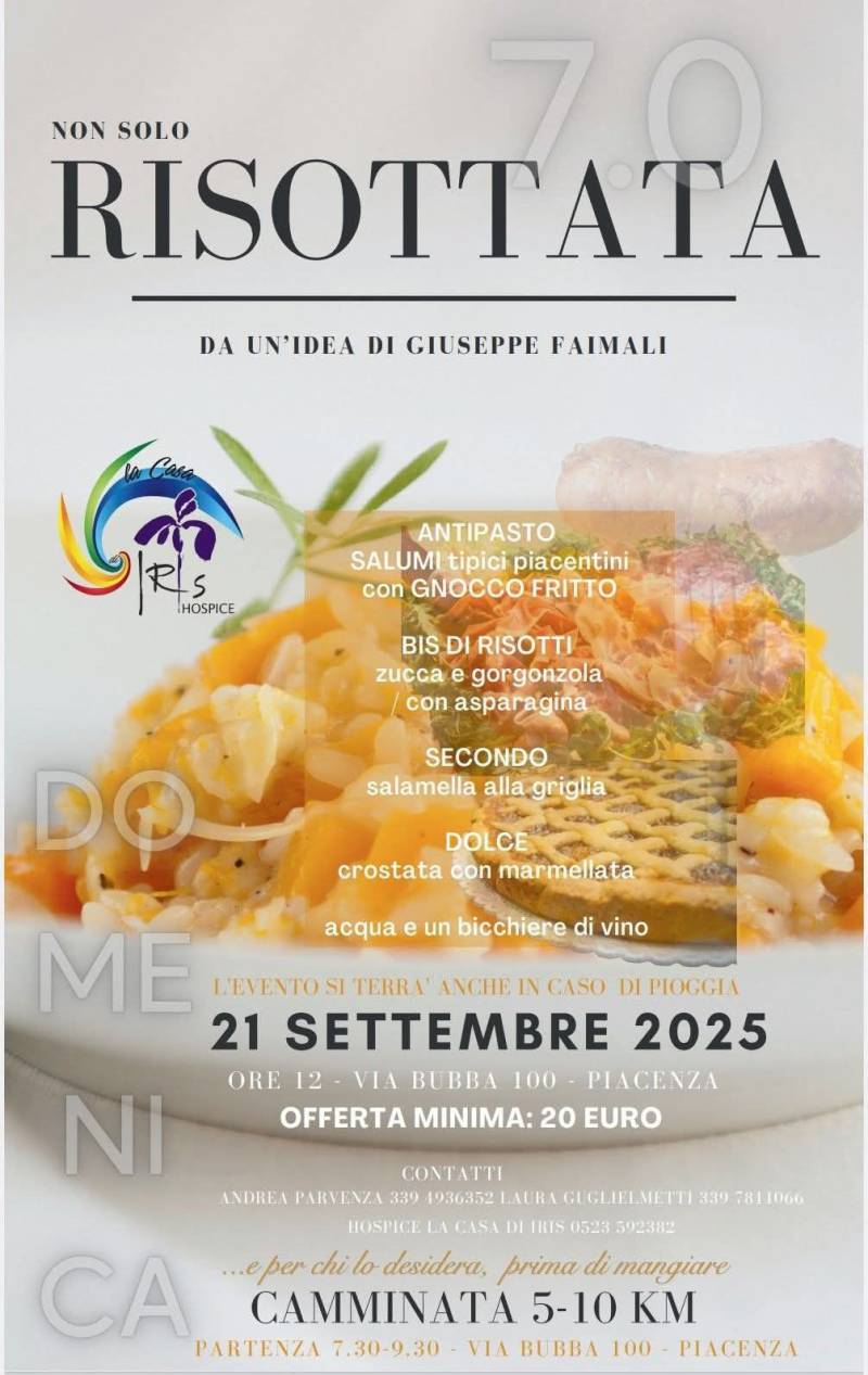 Domenica 21 settembre 2025 si terrà la settima edizione della camminata benefica a favore dell’Hospice “Casa di Iris” di Piacenza. Contestualmente si terrà la Risottata.