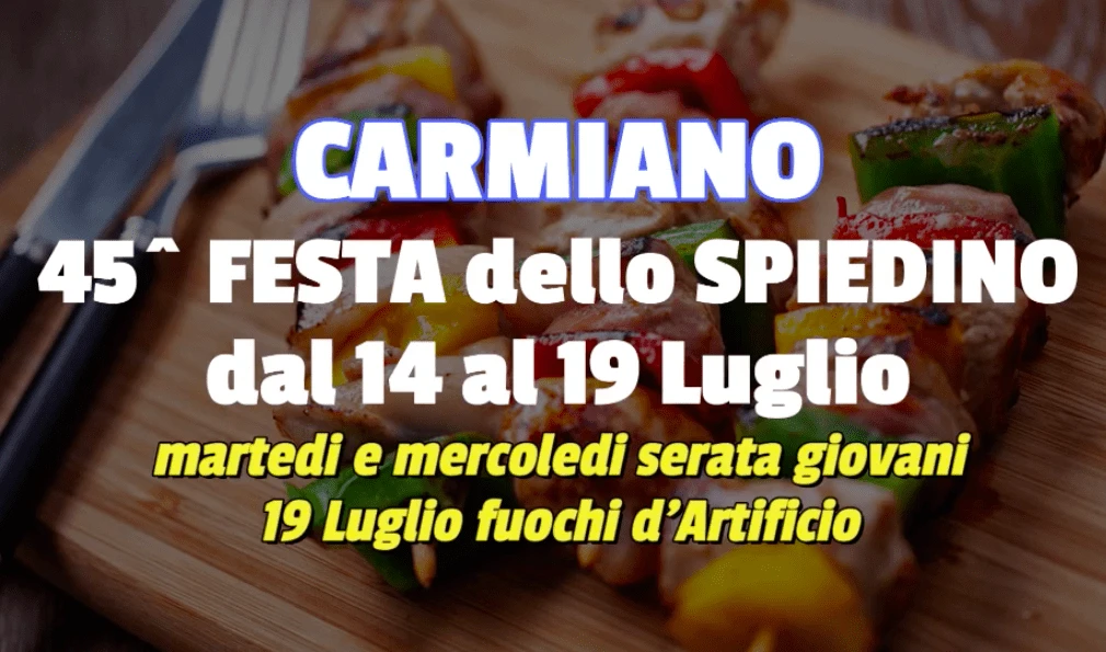 Ritorna a Carmiano la Sagra dello Spiedino dal 14 al 19 luglio. Dopo 3 anni di pausa forzata, sei giorni di festa con stand gastronomici, gonfiabili gratuiti e danze sulla nuova balera, con le orchestre: Daniela Cavanna, Alberto Kalle e Veronica Cuneo, Gianni e la Liscio Band e Paolo Bertoli.