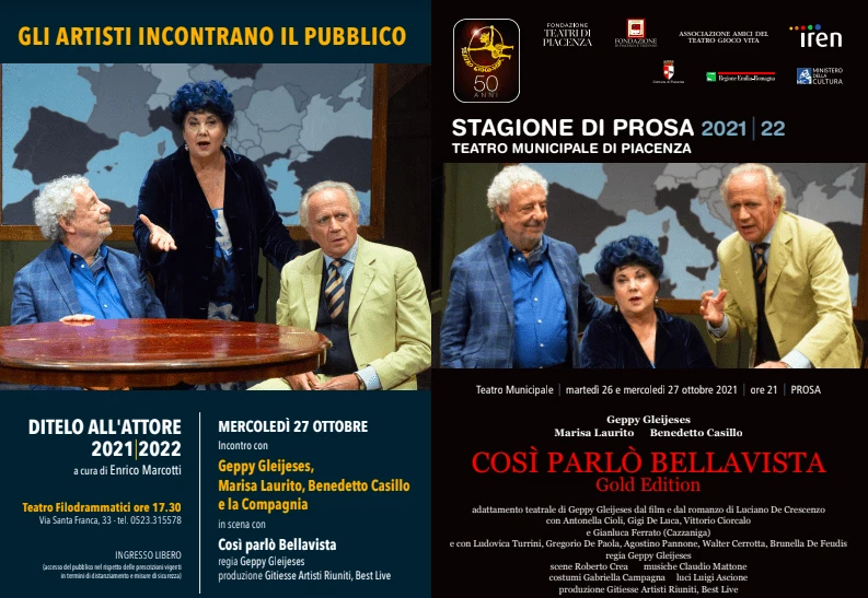 Mercoledì 27 ottobre alle ore 17.30 al Teatro Filodrammatici Geppy Gleijeses, Marisa Laurito, Benedetto Casillo e la Compagnia in scena con “Così parlò Bellavista” incontrano il pubblico. L’appuntamento è inserito nel programma di “Ditelo all’attore” curato dal critico teatrale Enrico Marcotti. Ritornano infatti gli incontri con i protagonisti della Stagione di Prosa del Teatro Municipale di Piacenza, proposti da Teatro Gioco Vita con l’Associazione Amici del Teatro Gioco Vita e il sostegno della Fondazione di Piacenza e Vigevano nell’ambito dei progetti di InFormazione Teatrale.