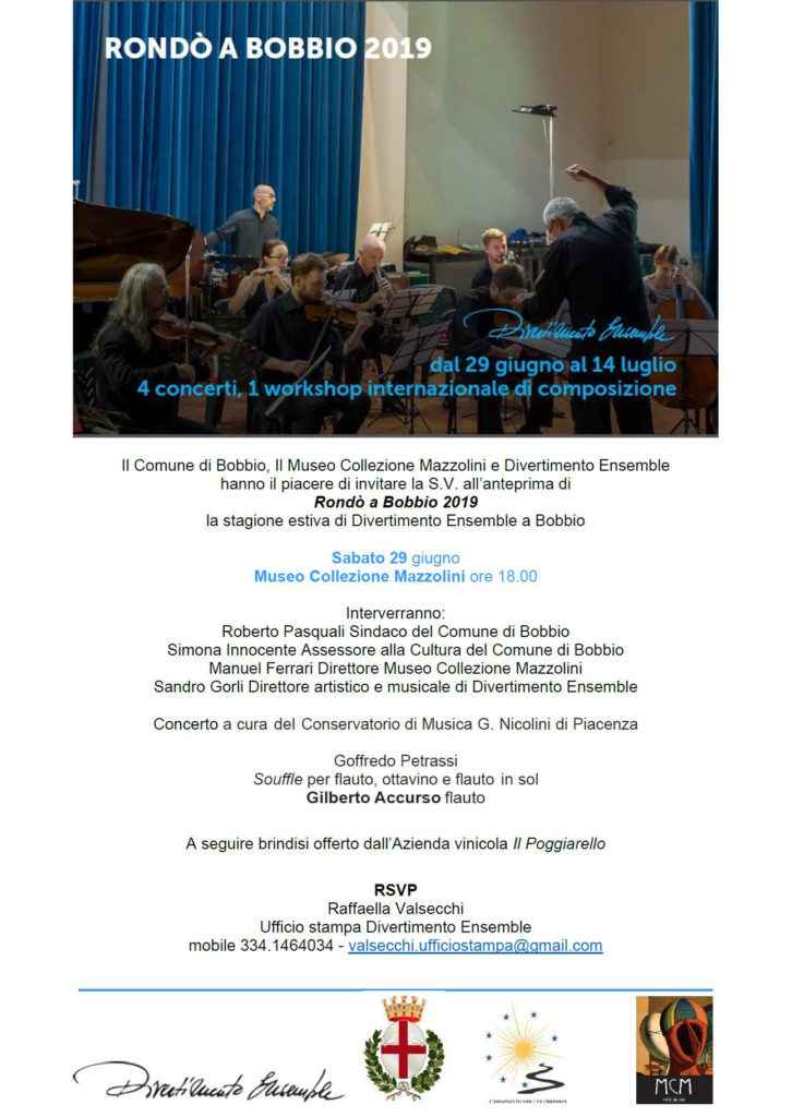 «Per la quinta estate siamo a Bobbio, in occasione dell’annuale International Workshop for Young Composers, corso residenziale di composizione, organizzato da IDEA-International Divertimento Ensemble Academy, in collaborazione con Ulysses Network rete europea della musica contemporanea. Destinato a una dozzina di giovani compositori provenienti da tutto il mondo, selezionati tra i tanti che rispondono alla nostra Call, il corso li vede lavorare con me e con i musicisti di Divertimento Ensemble, oltre che con due compositori in funzione di tutor: quest’anno Fabien Lévy e Francesco Filidei, già a Bobbio la scorsa estate. Come ogni anno, gli esiti della residenza vengono presentati al pubblico in occasione di alcuni concerti, due dei quali interamente dedicati all’esecuzione dei pezzi dei compositori selezionati dallo stesso Workshop. Diversamente il concerto inaugurale quest’anno porta in scena alcune delle cantanti selezionate da un altro progetto di IDEA: Call for Young Performers, Masterclass di canto tenuta dal soprano Alda Caiello. Il concerto presenta, tra le altre, una scelta di pagine tratte da Der Turm zu Babel di Mauricio Kagel, a cui quest’anno Divertimento Ensemble ha intitolato un ciclo di concerti nell’ambito della propria stagione milanese. Lo stesso programma propone inoltre pagine di John Cage, anticipando il ciclo monografico che Divertimento Ensemble dedicherà all’artista nel 2020. In collaborazione con il Conservatorio di Piacenza è invece l’anteprima di fine giugno: come ormai da tradizione la conferenza stampa di presentazione di Rondò a Bobbio è accompagnata da un momento musicale con la partecipazione di uno studente del Nicolini. Sede dell’anteprima il Museo Collezione Mazzolini, con cui si rinnova una collaborazione pluriennale che offre al nostro pubblico visite guidate all’importante collezione di arte contemporanea; anteprima condivisa con le rappresentanze del Comune di Bobbio, a cui va il mio grazie per il sostegno alle nostre attività bobbiesi, ma soprattutto per la convinta condivisione dei nostri progetti artistici».