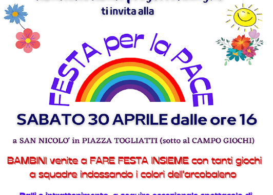 – SABATO 30 aprile ore 16.00 a San Nicolò presso la pista polivalente di Piazza Togliatti “FESTA per la PACE” con giochi per bambini e spettacolo di magia. Organizzato dall’associazione Abracadabra –Progetto Famiglie con la collaborazione della Pro Loco Amis ad San Niculò e di Croce Rossa Italiana.