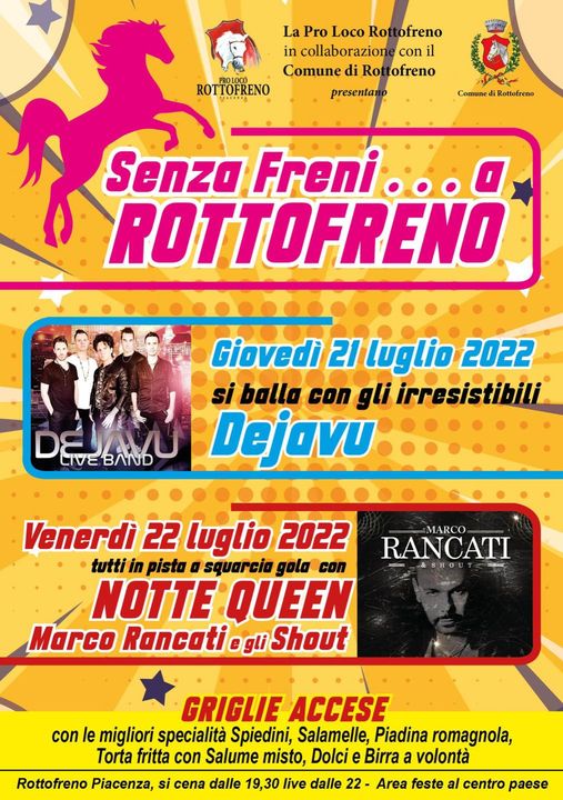 Rottofreno senza freni, il 21 e 22 luglio cibo e musica in primo piano, Si parte giovedì 21 luglio ballando con gli irresistibili Deja Vù, mentre venerdì 22 luglio tutti in pista con “Notte Queen” Marco Rancati e gli Shout.