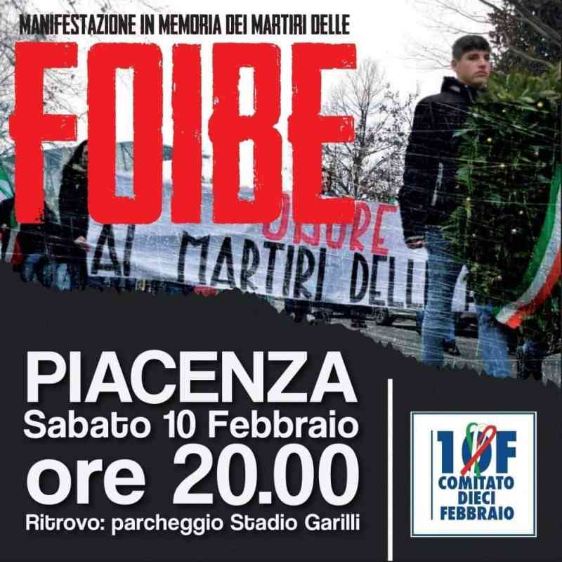 Si terrà il 10 febbraio alle ore 20 il corteo di commemorazione dei martiri delle foibe, un evento che a Piacenza da anni è un punto fermo per tutti quei cittadini che vogliono rendere omaggio ai loro connazionali caduti per mano dei partigiani comunisti di Tito. Ritrovo nel parcheggio dello stadio comunale. Un evento promosso dal Comitato 10 Febbraio in tutta Italia.
