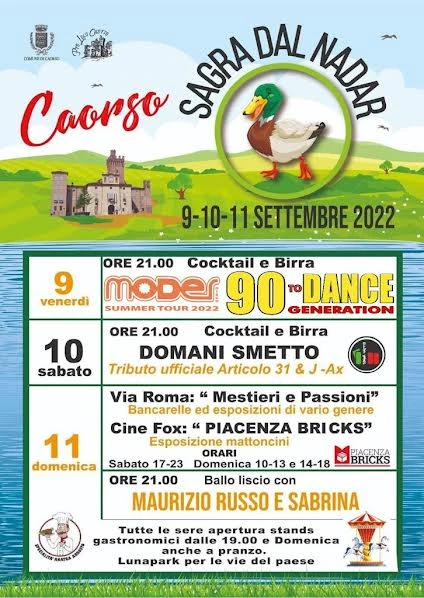 Sagra Dal Nadar 2022 a Caorso dal 9 all’11 settembre. Durante la manifestazione si potrà gustare l’anatra arrosto, varie specialità e divertirsi con musica e luna park