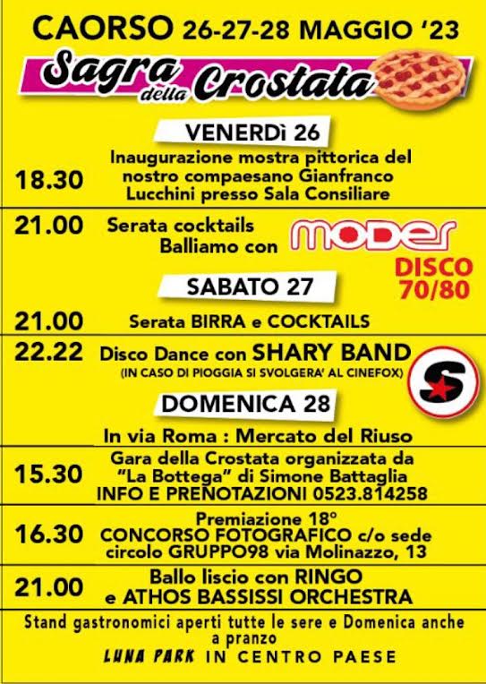Spazio anche alla musica: venerdì con la musica anni 70 e 80, sabato con la dance e domenica con il liscio. L’evento è proposto dalla locale Pro Loco e dal Comune di Caorso