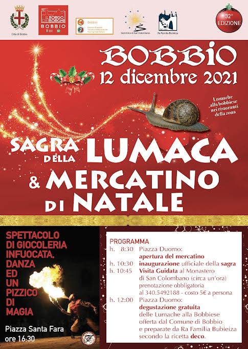 Sagra della Lumaca e il Mercatino di Natale domenica 12 dicembre a Bobbio. Il Borgo dei Borghi si prepara al Natale con il tradizionale appuntamento delle feste.