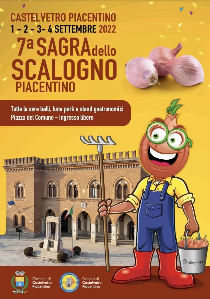 Sagra Dello Scalogno a Castelvetro Piacentino dal 1 al 4 settembre 2022. Tutti i giorni mostre street food e stand gastronomici con specialità del territorio e a base di scalogno, la domenica anche a pranzo.