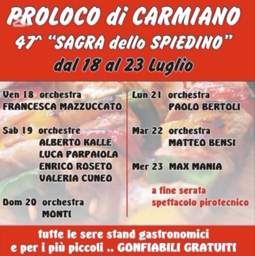 Sagra dello spiedino 2025 47° edizione a Carmiano di Vigolzone da venerdì 18 a mercoledì 23 luglio. Ogni sera stands gastronomici, danze con le orchestre e gonfiabili gratuiti grazie all’organizzazione della Pro loco di Carmiano. Mercoledì 23 luglio gran finale pirotecnico.