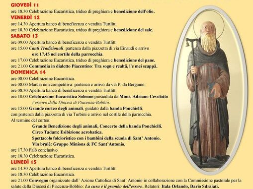 Nella mattinata della domenica alle 10,00 Messa solenne presieduta dal vescovo della diocesi di Piacenza-Bobbio mons. Adriano Cevolotto. Le altre messe seguono l’orario festivo recentemente aggiornato.. Naturalmente la vendita dei Turtlitt inizia alle ore 8,30 e seguirà per tutta la giornata, esclusa la pausa pranzo. Durante la giornata i ragazzi del FC S.Antonio offrono vin brulè.