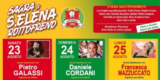 Sagra di Sant’Elena dal 23 al 25 agosto a Rottofreno. La locale Pro Loco propone una tre giorni piena di divertimento, orchestre di livello e buon cibo.