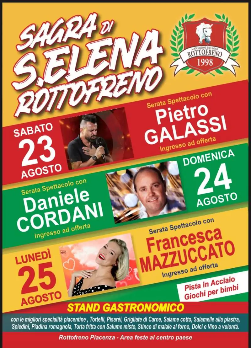 Sagra di Sant’Elena dal 23 al 25 agosto a Rottofreno. La locale Pro Loco propone una tre giorni piena di divertimento, orchestre di livello e buon cibo.