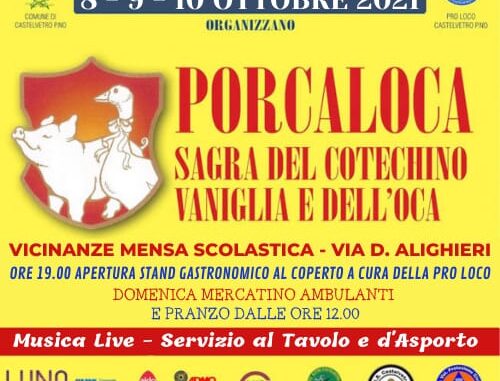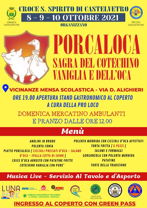 Da venerdì 8 a domenica 8 ottobre è in programma la Sagra Porcaloca a Croce Santo Spirito di Castelvetro. In questi tre giorni sono previsti tanti appuntamenti dalla musica live, tutte le sere, alla gastronomia. In particolare si possono assaggiare specialità del territorio come anolini in brodo, cosce d’oca, cotechino vaniglia, e altre bontà con