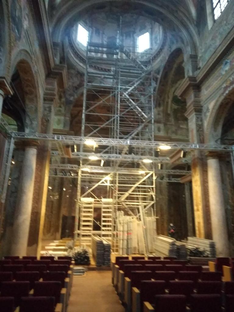 E’ stato, quindi, predisposto l’immediato progetto redatto dagli uffici del Comune e approvato dalla competente Soprintendenza Archeologia Belle Arti e Paesaggio, che prevede da un lato, come detto, la messa in sicurezza della copertura esterna del tiburio e dell’estradosso della cupola e, dall’altro, l’installazione del ponteggio per la messa in sicurezza delle decorazioni pittoriche della cupola. A seguito dell’installazione del ponteggio potranno essere definite con precisione le modalità dell’intervento di restauro per la messa in sicurezza degli affreschi della cupola, posta nella zona soprastante al palco.