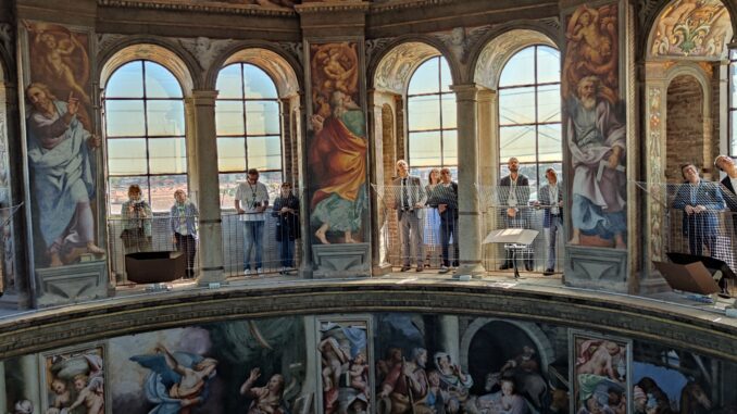 Non conosce eccezioni il successo e l’interesse di piacentini e non per la Salita al Pordenone. Ha infatti fatto registrare ancora una volta il tutto esaurito l’apertura straordinaria e gratuita di ieri, domenica 18 settembre, organizzata dalla Banca di Piacenza in occasione del 32° Convegno del Coordinamento legali di Confedilizia (hanno compiuto il percorso di visita, tra gli altri, il presidente nazionale Giorgio Spaziani Testa, il segretario generale Alessandra Egidi, il responsabile del Centro studi Antonio Nucera, il responsabile delle relazioni istituzionali Giovanni Gagliani Caputo, il presidente di Confedilizia Piacenza Antonino Coppolino con il direttore Maurizio Mazzoni). Come noto, la Salita alla Cupola di Santa Maria di Campagna può essere affrontata solo a piccoli gruppi che – dalle 10 alle 19 – hanno ammirato da vicino Profeti e Sibille affrescate da Antonio de’ Sacchis (e raccontate dalle guide di Minerva Arte) e potuto godere di uno splendido panorama a 360 gradi sulla città, complice una splendida giornata di sole che ha favorito l’arrivo – per visitare le bellezze di Santa Maria di Campagna – di turisti da fuori provincia, soprattutto da Lombardia e Toscana.