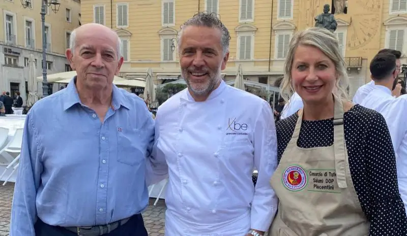 La ciliegina sulla torta è stato l’omaggio che lo chef stellato Giancarlo Perbellini, autore del menu della serata, ha voluto rendere a Piacenza, andando a visitare lo spazio dedicato ai salumi DOP Piacentini, incontrando e omaggiando il direttore del Consorzio dei Salumi DOP Piacentini Roberto Belli e la segretaria del Consorzio Lorella Ferrari. Gesto che costituisce motivo di grande orgoglio poiché è un implicito riconoscimento, sul campo, dell’eccellenza di Coppa, Salame e Pancetta Piacentina.