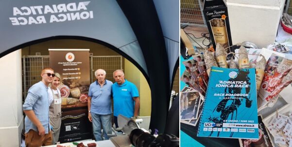 Ma l’intelligente novità di questa terza edizione è stata il “Food Project”. L’Adriatica Ionica Race ha inserito nel proprio programma un Press Tour con la partecipazione di giornalisti non solo della stampa sportiva ma anche di quelli della stampa Food compresi Food Blogger provenienti da tutta Europa. L’obiettivo è stato quello di avvicinare la stampa non solo al mondo del ciclismo ma anche alla promozione delle eccellenze alimentari legate ai territori attraversati dalla manifestazione. Merito di questa idea geniale è di Moreno Argentin che dopo gli importanti trascorsi come atleta, Campione del mondo di ciclismo su strada nel 1986 a Colorado Springs, oggi è organizzatore di questa importante manifestazione agonistica. Nell’attraversamento della regione Emilia -Romagna durante la terza tappa da Ferrara a Brisighella l’Assessorato all’Agricoltura della Regione Emilia -Romagna ha chiesto ai propri Consorzi di Tutela di essere presenti, nell’apposita area Hospitality, proprio di fronte all’arrivo della tappa, con i loro prodotti. E qui tra l’olio DOP di Brisighella, la Piadina Romagnola IGP, la Salama di Ferrara, i tre salumi DOP Piacentini con Coppa Piacentina, Salame Piacentino e Pancetta Piacentina, hanno ricevuto il plauso da parte degli importanti ospiti presenti, avendo avuto modo di fare una esperienza gustativa di alto livello.