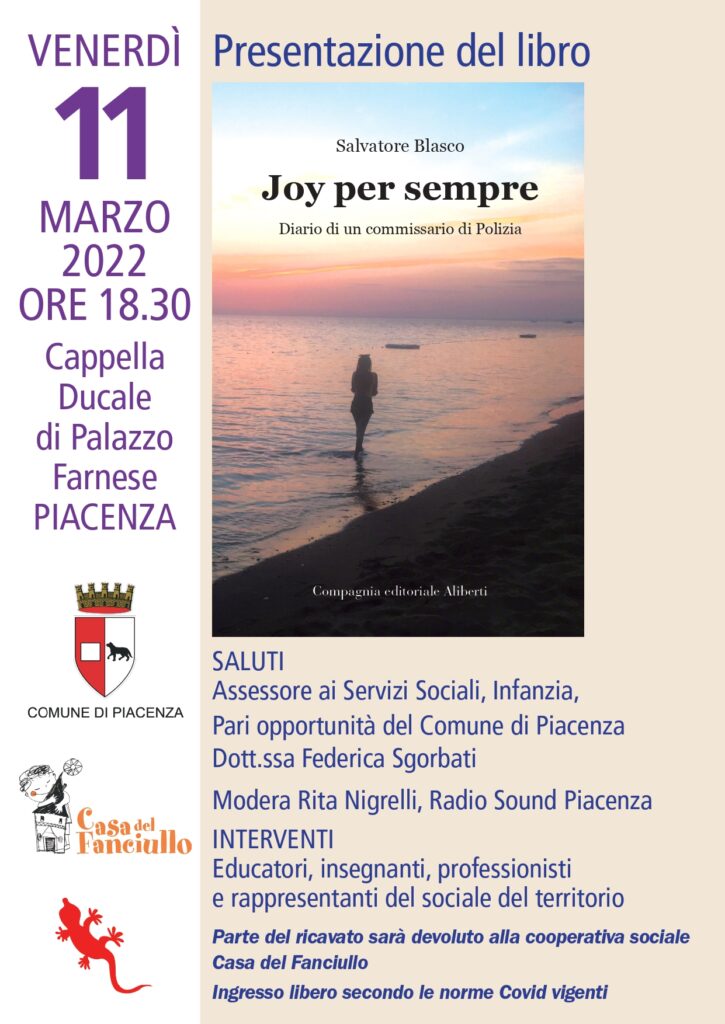 Venerdì 11 marzo, alle 18.30, presso la Cappella Ducale di Palazzo Farnese verrà presentato il libro di Salvatore Blasco “Joy per sempre. Diario di un commissario di Polizia” (Aliberti), con prefazione di Vito Mancuso. L’incontro si aprirà con i saluti di Federica Sgorbati, assessore ai Servizi sociali, Infanzia e Pari Opportunità del Comune di Piacenza e sarà coordinato da Rita Nigrelli, direttore di Radio Sound. L’iniziativa rientra negli eventi organizzati in occasione della Giornata internazionale della Donna.