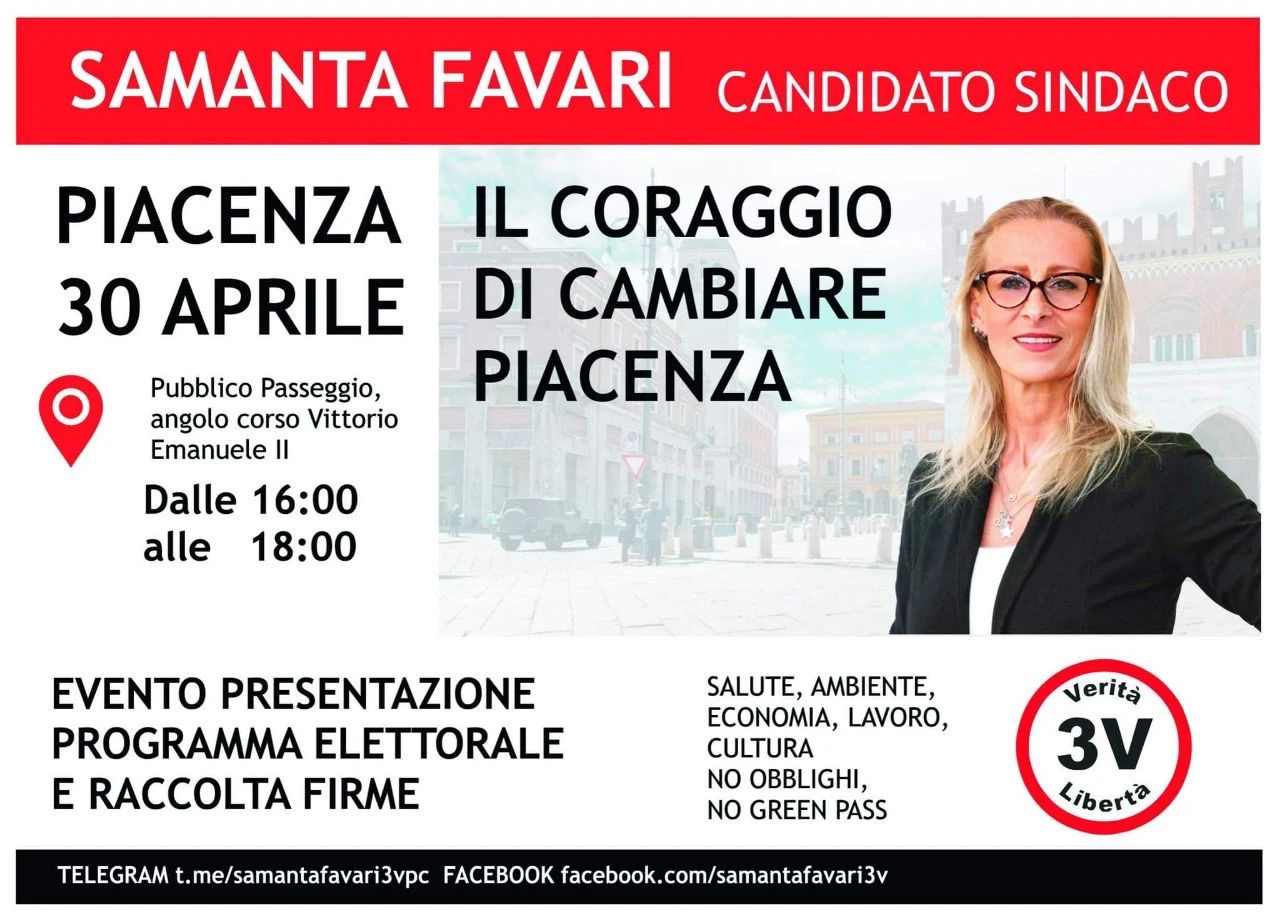 Sabato 30 aprile, alle ore 16.00, presso il Pubblico Passeggio (angolo corso Vittorio Emanuele II) la candidata sindaca Samanta Favari si presenterà alla città di Piacenza. Insieme ai candidati consiglieri della lista 3V, racconterà i principali punti del programma proposto per le prossime elezioni amministrative.
