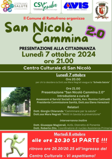 San Nicolò Cammina 2.0, presentazione alla cittadinanza il 7 ottobre alle ore 21. Le camminate partiranno dal Centro culturale martedì 8 ottobre con ritrovo alle 20.20 e partenza alle 20.30.