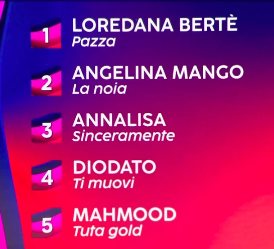 La graduatoria vede al primo posto Loredana Bertè seguita dalla sorprendente Angelina Mango e da Annalisa regina ormai del tormentone. Al quarto posto si piazza il bravo Diodato e al quinto Mahmood. Peccato non vedere Gazzelle nella top five.