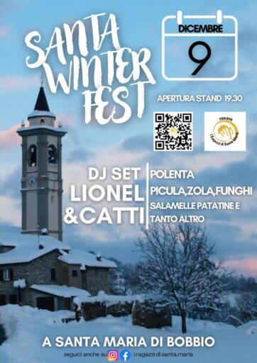 Santa Winter Fest, il via alle feste il 9 dicembre a Santa Maria di Bobbio. Un sabato tutto da vivere grazie alla cena con Polenta e Picula, Zola o Funghi, salamelle e tanto altro.