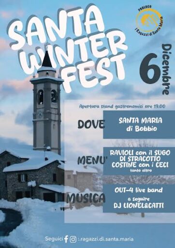 Santa Winter Fest il 6 dicembre a Santa Maria di Bobbio. Spazio alle eccellenze gastronomiche come i Ravioli al sugo di stracotto, costine con ceci e tanto altro. Non mancherà inoltre lo spazio musicale con Out 4 e DJ set con Lionel e Catti nella tensostruttura riscaldata!