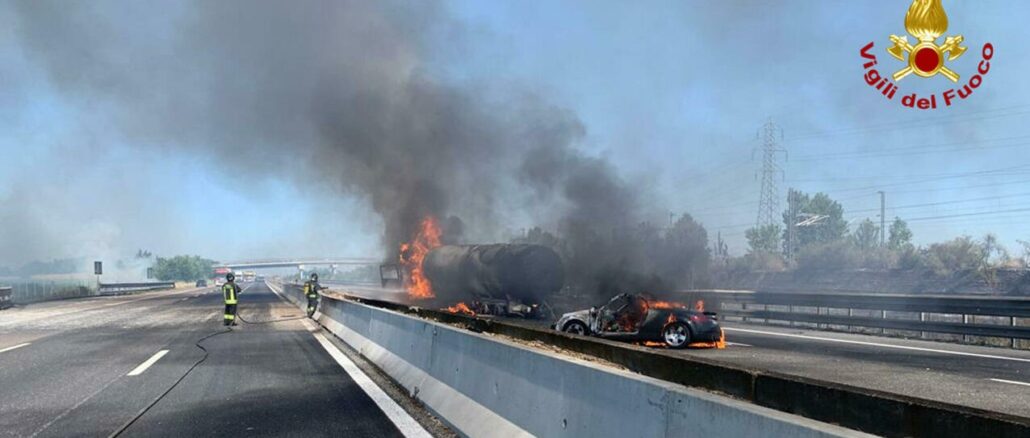 Schianto tra un’auto e due tir in autostrada, mezzi in fiamme e morti i due camionisti