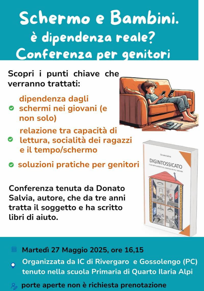 Una valida occasione per genitori, nonni, educatori di confrontarsi anche sulle soluzioni pratiche quando si tratta del rapporto tra bambini e schermi, siano essi della televisione o dei videogame. Al mattino, lo scrittore incontrerà i bambini e presenterà i suoi libri per bambini “Giuly e i mutantini“.
