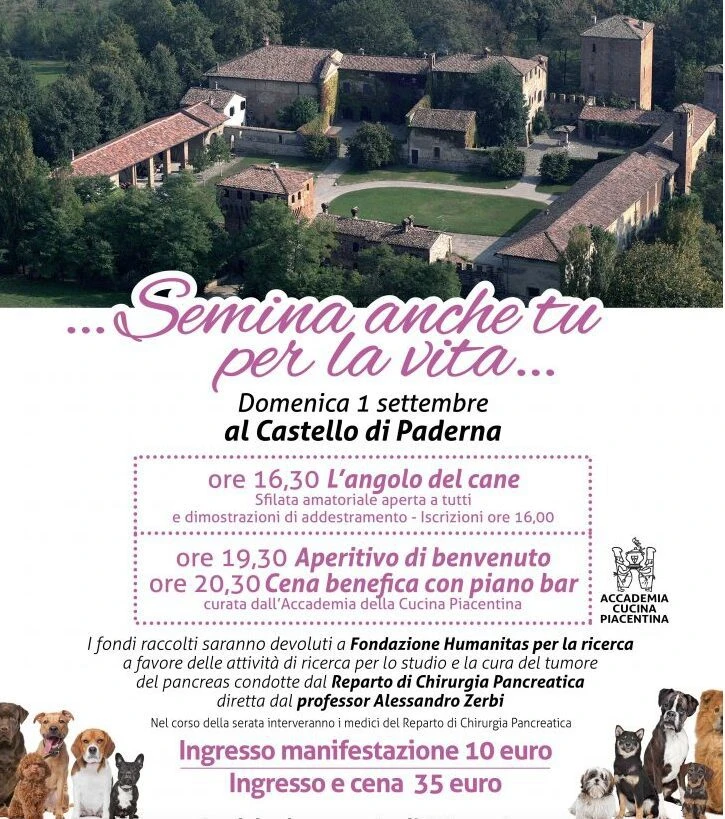 Appuntamento alle 16.30 con “L’angolo del cane”, una sfilata amatoriale aperta a tutti e a seguire dimostrazioni di addestramento. Alle 19.30 l’aperitivo di benvenuto e la cena di beneficenza con i cuochi dell’Accademia della cucina piacentina e piano bar. All’evento prenderanno parte anche il professor Alessandro Zerbi, Responsabile di Chirurgia Pancreatica di Humanitas, e altri specialisti del suo team.