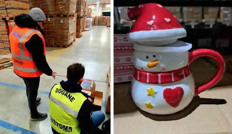Nel corso dei controlli, i funzionari dei Reparti Controlli doganali ed Antifrode hanno sottoposto a verifica 6319 piatti, tazze e bicchieri natalizi, importati dalla Cina, recanti fallaci indicazioni di origine e provenienza.