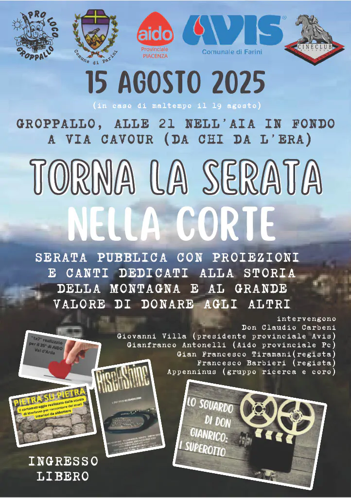Dopo il grande successo della prima edizione presentata lo scorso anno, torna a Groppallo di Farini la “SERATA IN CORTE”, l’appuntamento di ferragosto con cinema e musica nella corte a valle della frazione che un tempo era il tipico luogo di aggregazione della gente del luogo e dei tanti villeggianti estivi.