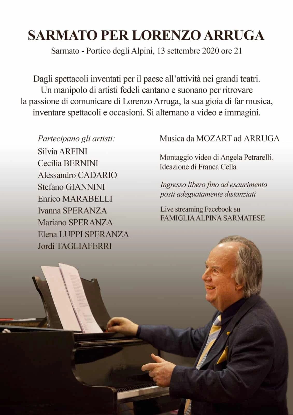 Domenica 13 settembre alle ore 21 a Sarmato è in programma un evento caro al territorio piacentino. Infatti sul palco della sede degli Alpini è prevista una serata per ricordare un grande personaggio amico del paese, il Maestro Lorenzo Arruga, musicologo, scrittore, compositore, scopritore di talenti. Alcuni suoi allievi gli renderanno omaggio.